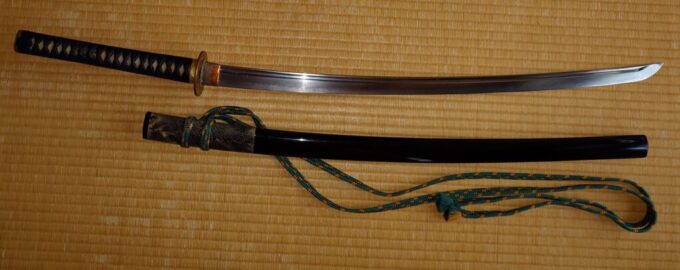 平成4年の剣で、2尺3寸5分、梵字と不動明王が彫ってあります。金具は勝ち虫、緑の柄糸です。