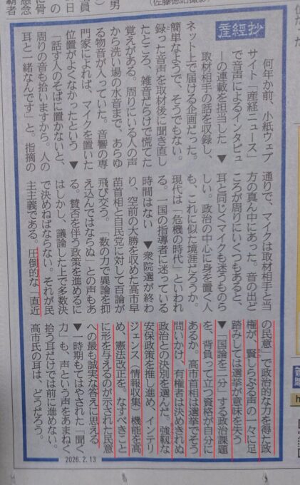 ’26年 2月13日産経抄に自民党内に左巻き議員の残党がいることを懸念していましたが、私は「その通り」思ったくらいでした。